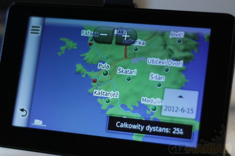 Bardzo przypadła mi do gustu umiejętność Garmin nuvi do „uczenia” się moich preferencji (funkcja myTrends) i co ważniejsze, do zapamiętywania tras. Wystarczy w ustawieniach – mapa i pojazdy – warstwy mapy – wybrać „Dziennik podróży”, żeby na ekranie ciągnęła się za nami cienka nitka historii naszej podróży. W większości przypadków wystarczy podążać za nią, żeby wrócić do domu. Pozwala też zorientować się gdzie była ta piękna dzika plaża, na którą przypadkiem trafiliśmy. Do pełni szczęścia Garmin dostarczył nam aplikację „Where I’ve Been” (dziwnym trafem tytuł tej jednej aplikacji nie jest w moim modelu przetłumaczony na polski). Wystarczy kliknąć i możemy przeglądać historię naszych tras wspominając wakacje albo czas stracony w korkach w centrum miasta.
